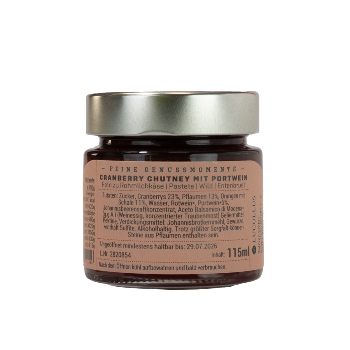 Zutaten: Zucker, Cranberrys 23%, Pflaumen 13%, Orangen mit Schale 11%, Wasser, Rotwein*, Portwein*5%, Johannisbeerensaftkonzentrat, Aceto Balsamico di Modena*(g.g.A.) (Weinessig, konzentrierter Traubenmost) Geliermittel: Pektine, Verdickungsmittel: Johannisbrotkernmehl, Gewürze*enthält Sulfite. Alkoholhaltig. Trotz größter Sorgfalt können Steine aus Pflaumen enthalten sein.