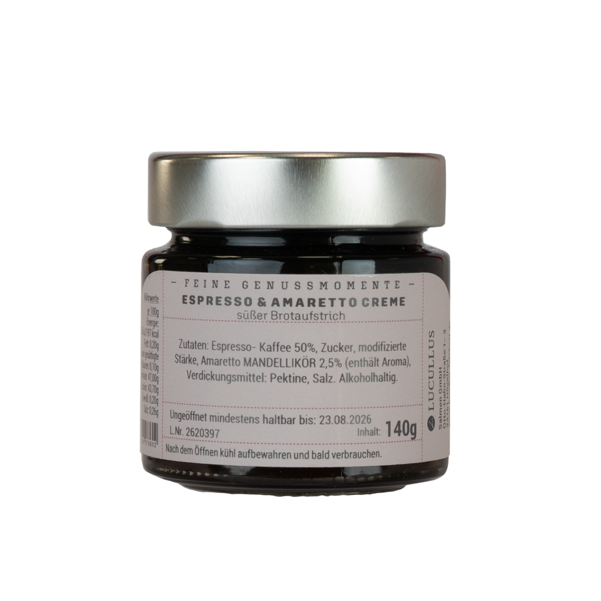 Die Lucullus Espressocreme mit Amaretto begeistert nicht nur Espressoliebhaber. Die kräftige Kaffeecreme ist hervorragend mit köstlichem Amarettolikör verfeinert. Ein Genuss zu Weißbrot, Croissants oder feinem Gebäck.
