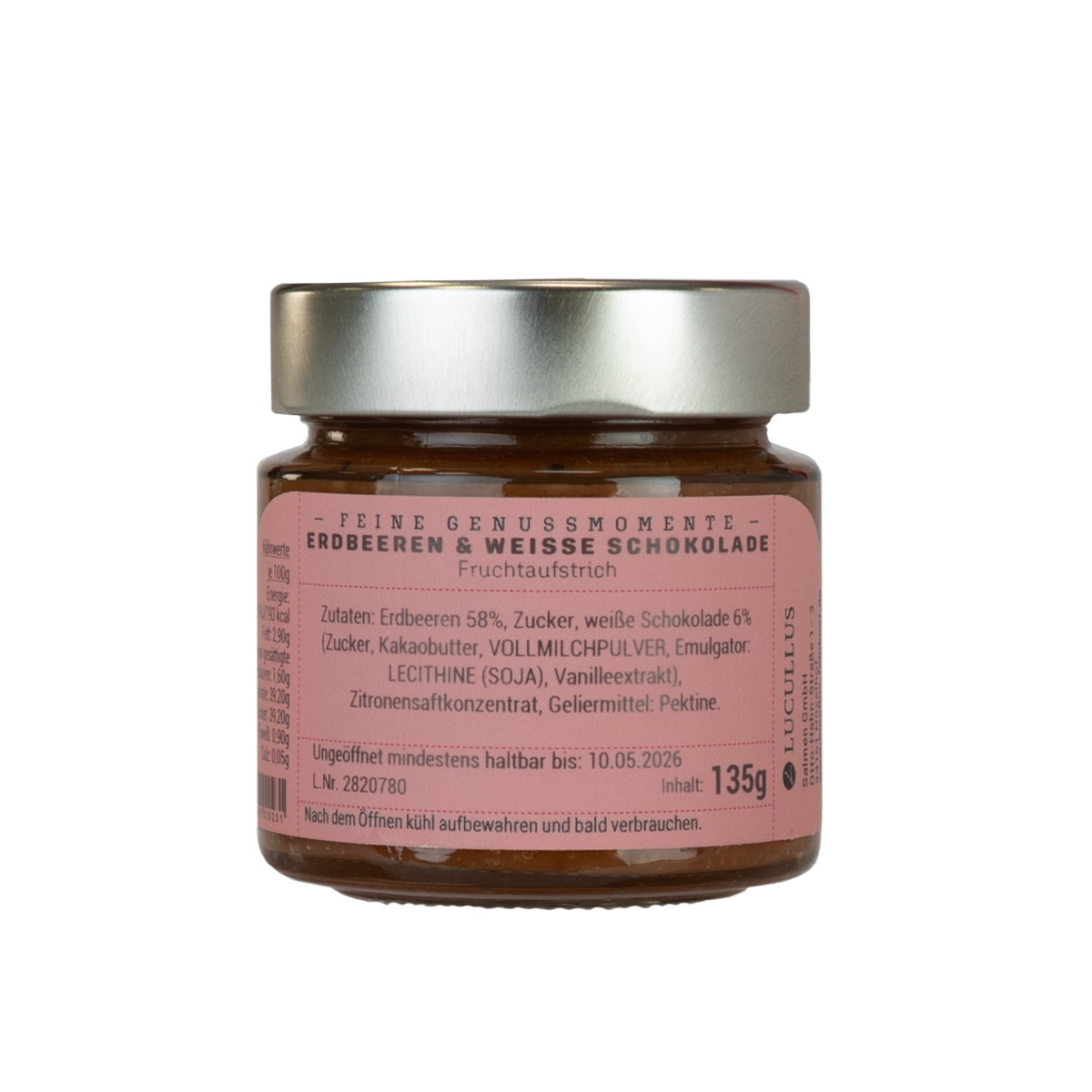Erdbeeren 58%, Zucker, weiße Schokolade 6% (Zucker, Kakaobutter, Vollmilchpulver, Emulgator: Lecithine (Soja), Vanilleextrakt), Zitronensaftkonzentrat, Geliermittel: Pektine