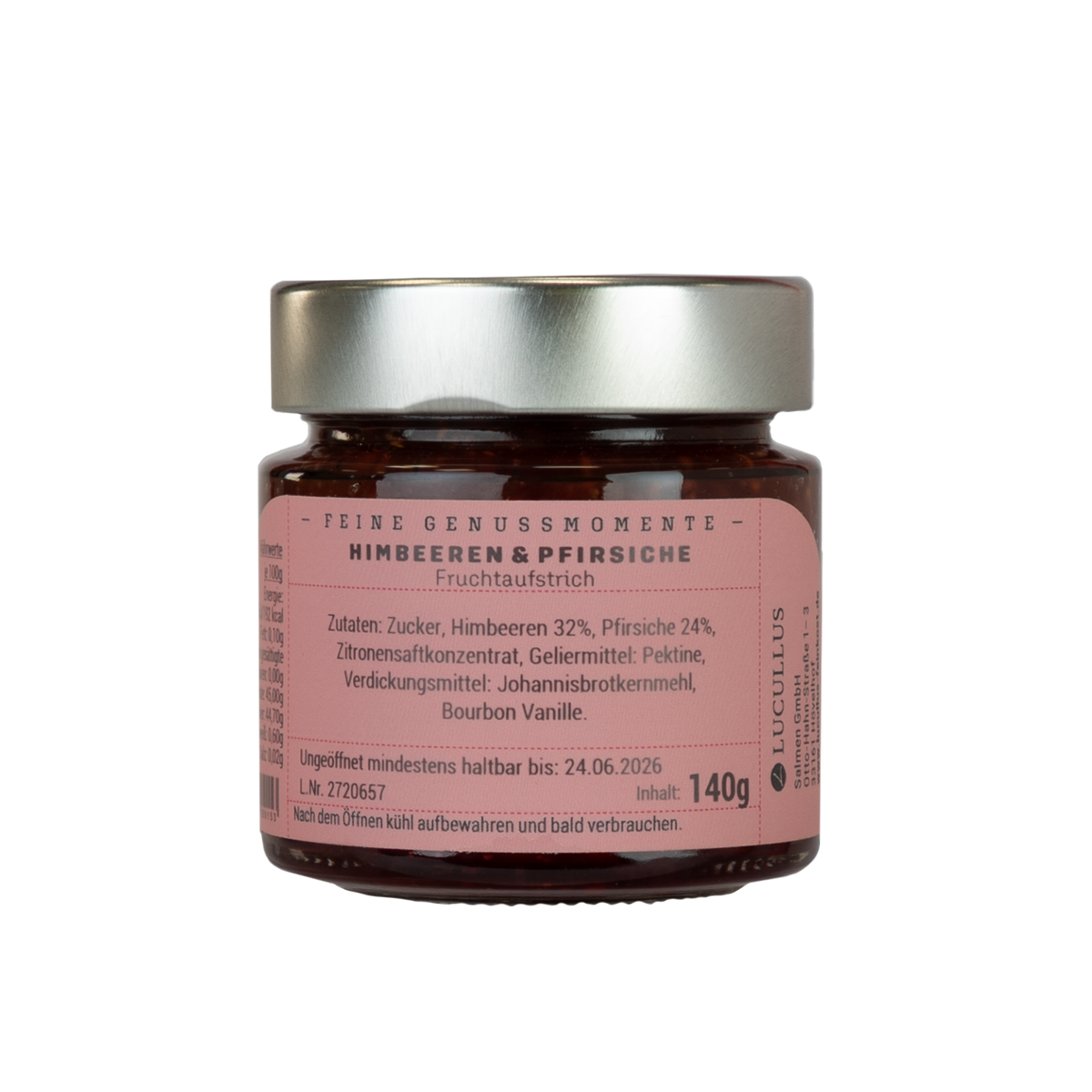 Zucker, Himbeeren 32%, Pfirsiche 24%, Zitronensaftkonzentrat, Geliermittel: Pektine, Verdickungsmittel: Johannisbrotkernmehl, Bourbon Vanille