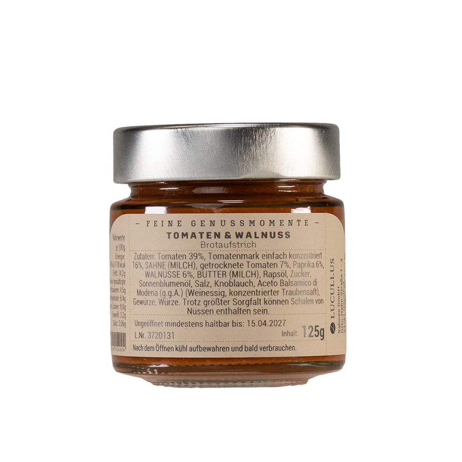Tomaten 39%, Tomatenmark einfach konzentriert 18%, Sahne (Milch), getrocknete Tomaten 9%, Paprika 6%, Walnüsse 6%, Butter (Milch), Olivenöl, Zucker, Salz, Aceto Balsamico di Modena (Weinessig, konzentrierter Traubensaft), Gewürze, Würze Trotz größter Sorgfalt können Schalen von Walnüssen enthalten sein.