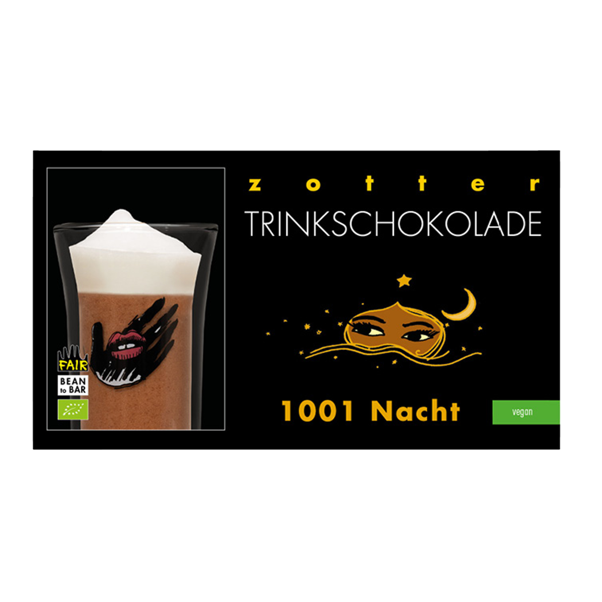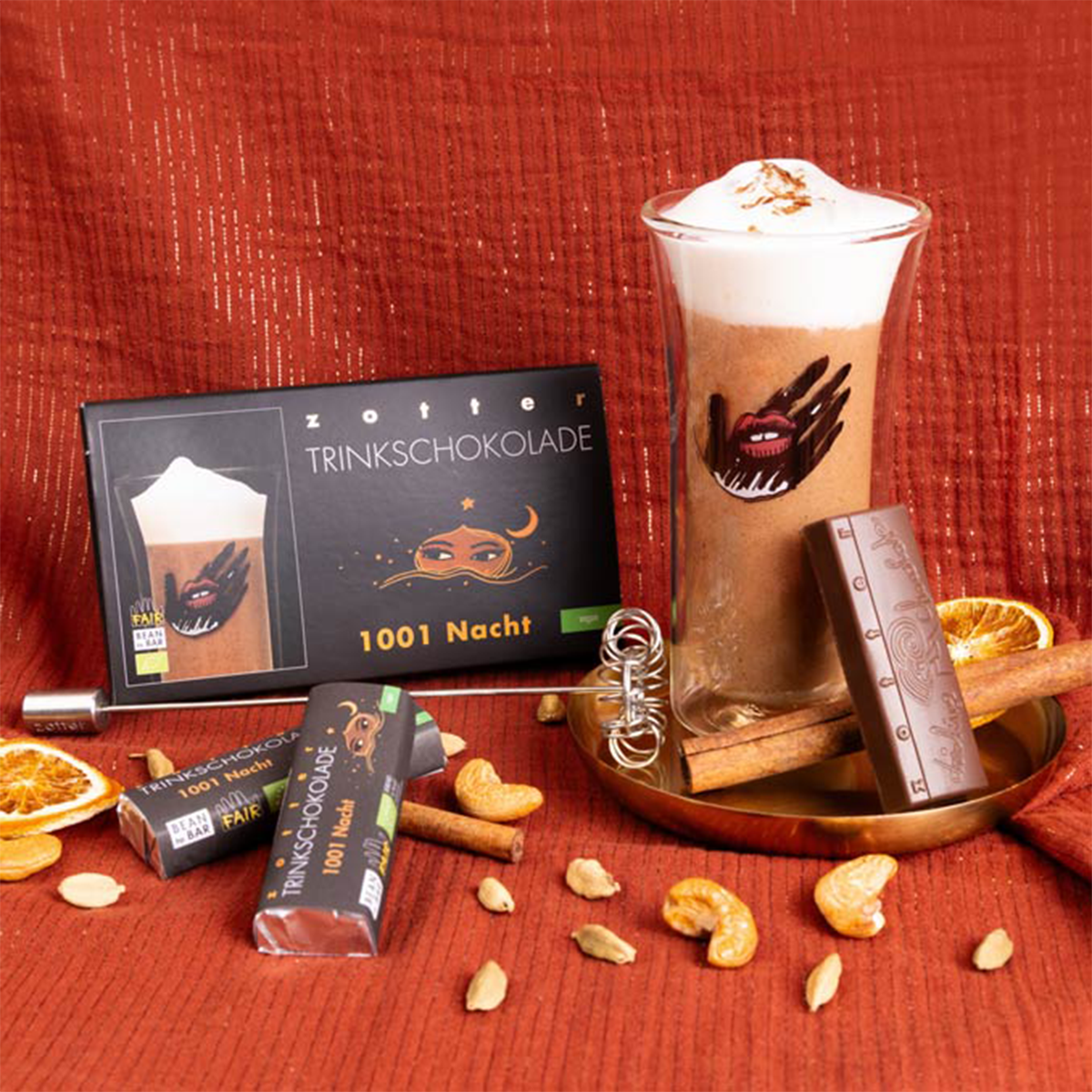 Märchenhafte Trinkschokolade mit orientalischer Note, gesüßt mit Dattelzucker aus gemahlenen Datteln mit feiner Karamellnote. Die Basis: Cashewnougat, verfeinert mit Orangenöl, Zimt, Kardamom, Ingwer, Kurkuma und prickelndem Timut-Pfeffer. Komplett vegan und so vielseitig wie die Märchen aus 1001 Nacht.