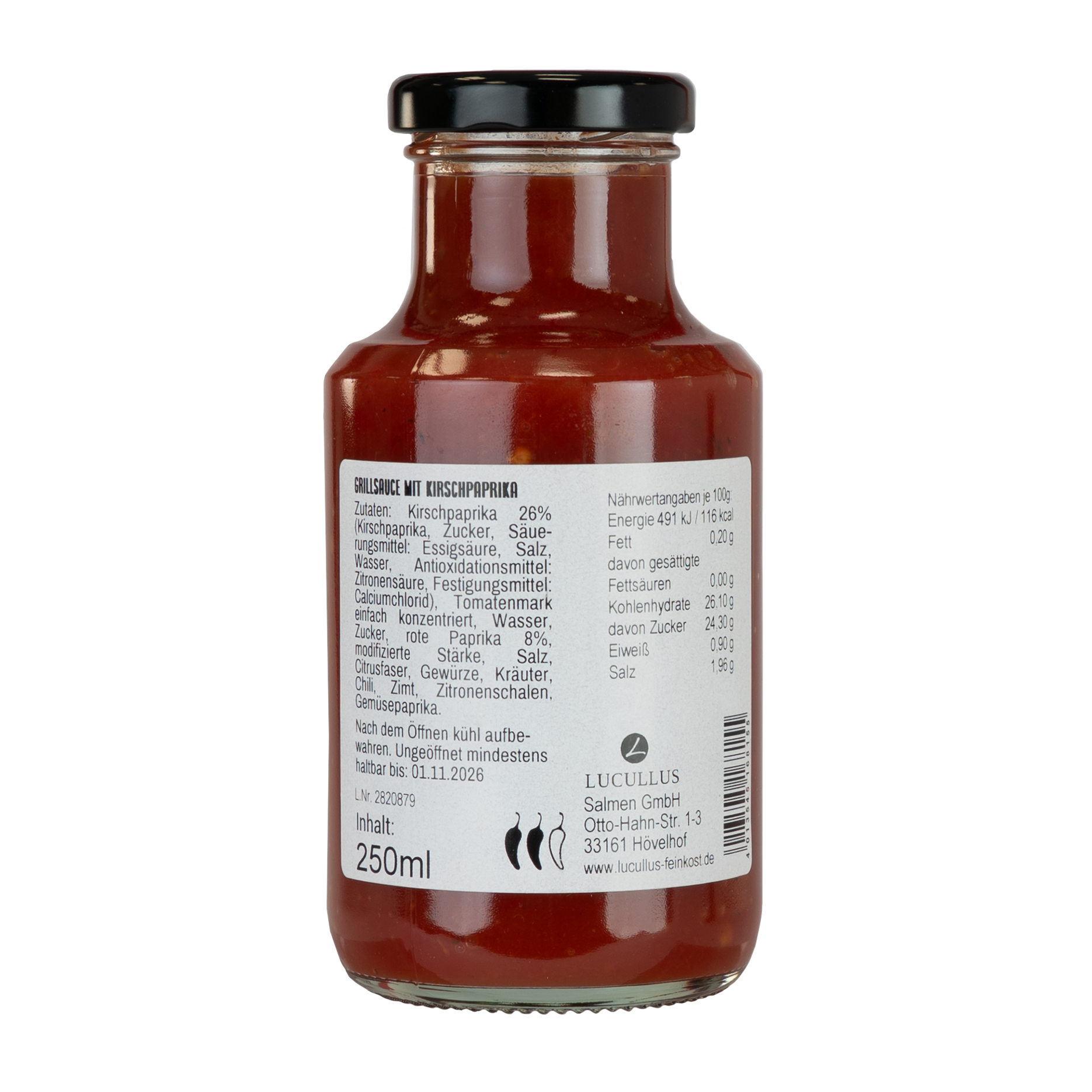 Kirschpaprika 27% (Kirschpaprika, Zucker, Säurungsmittel: Citronensäure, Salz, Wasser, Antioxidantionsmittel:Zitronensäure), Zucker, Wasser, rote Paprika 8%, modifizierte Stärke, Salz, Citrusfaser, Gewürze, Kräuter, Chili, Zimt, Zitronenschalen, Gemüsepaprika