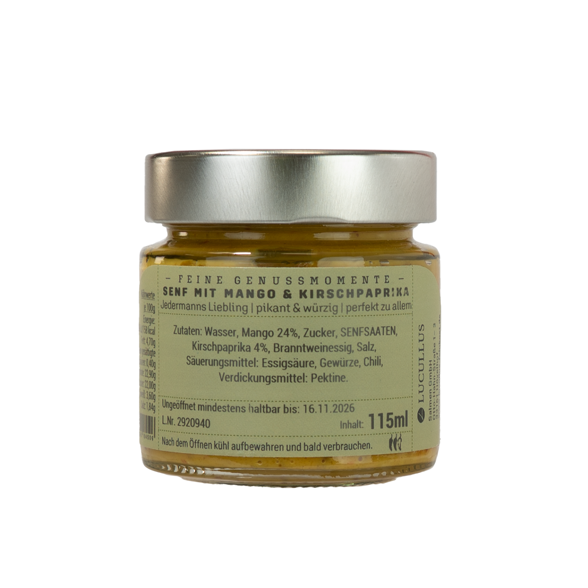 Zutaten: Wasser, Mango 24%, Zucker, Senfsaaten, Kirschpaprika 4%, Branntweinessig, Salz, Säuerungsmittel: Essigsäure, Gewürze, Chili, Verdickungsmittel: Pektine.