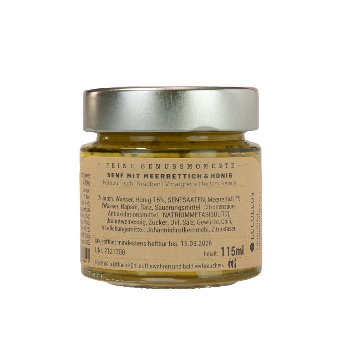 Einen wahren Genussmoment erlebt man mit dem Senf Surf & Turf - Meerrettich & Honig von Lucullus. Dieser besondere Senf eignet sich perfekt für Fischgerichte, zum Verfeinern von Salat und hellem Fleisch. Ein herausragender mittelscharfer Kräutersenf für Feinschmecker.