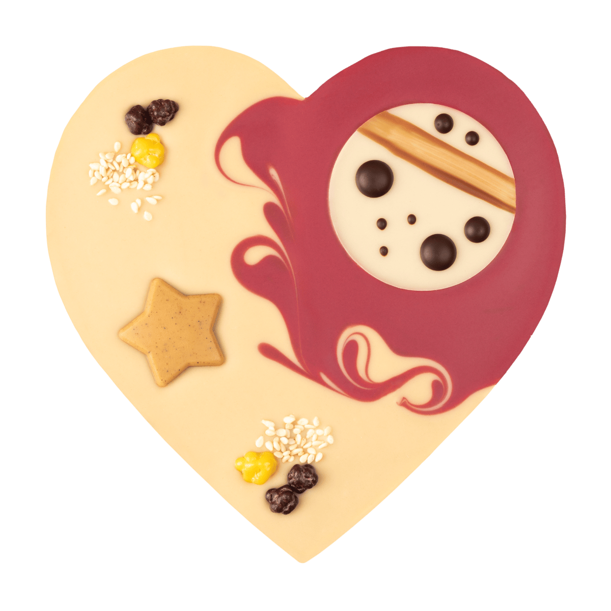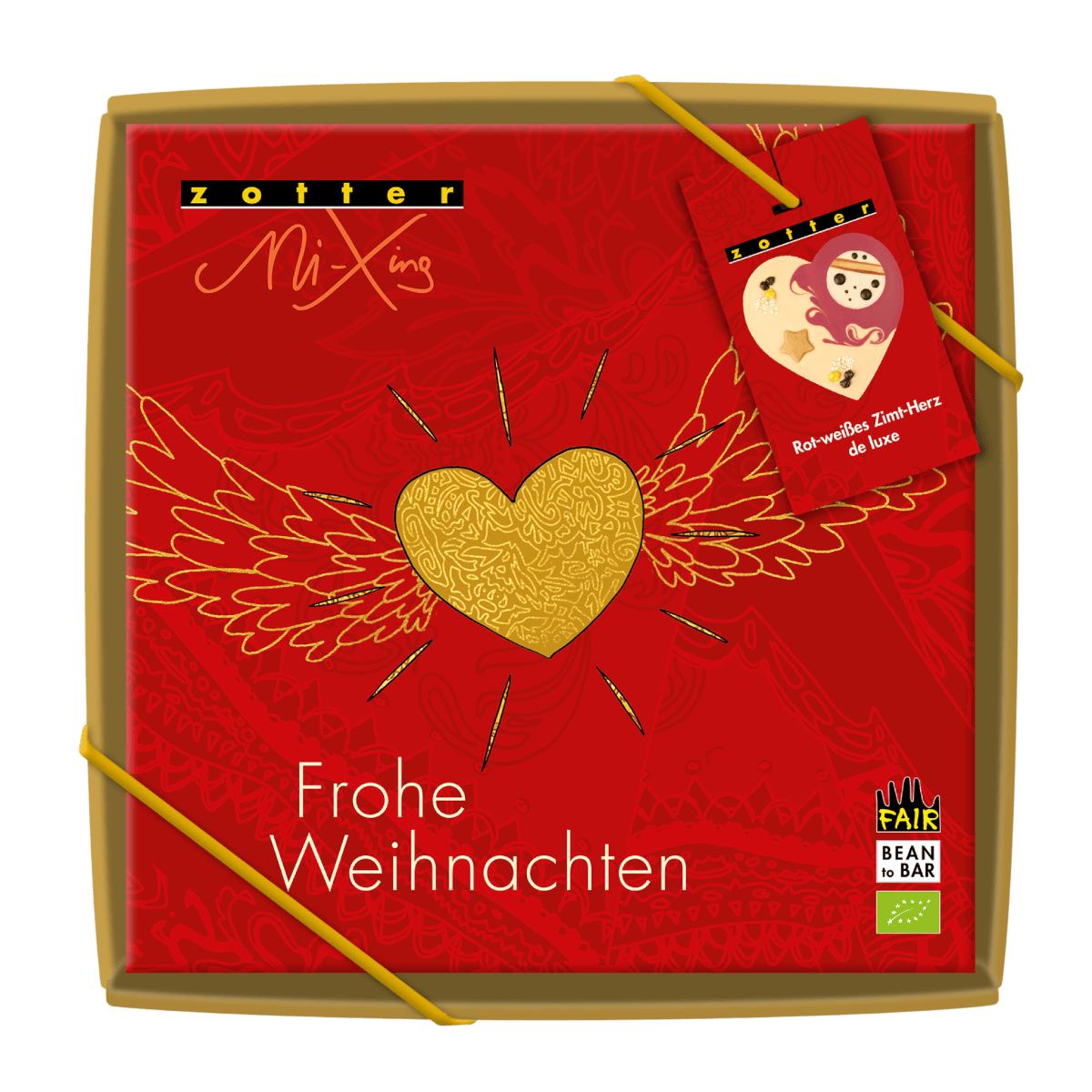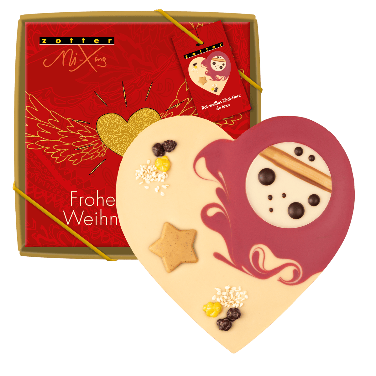 Ein Schokoherz gefüllt mit weihnachtlicher Zimtcreme. Verziert mit einem Muster aus fruchtiger Himbeerkuvertüre und weißer Schokolade. Verpackt in einer weihnachtlichen Geschenkbox.