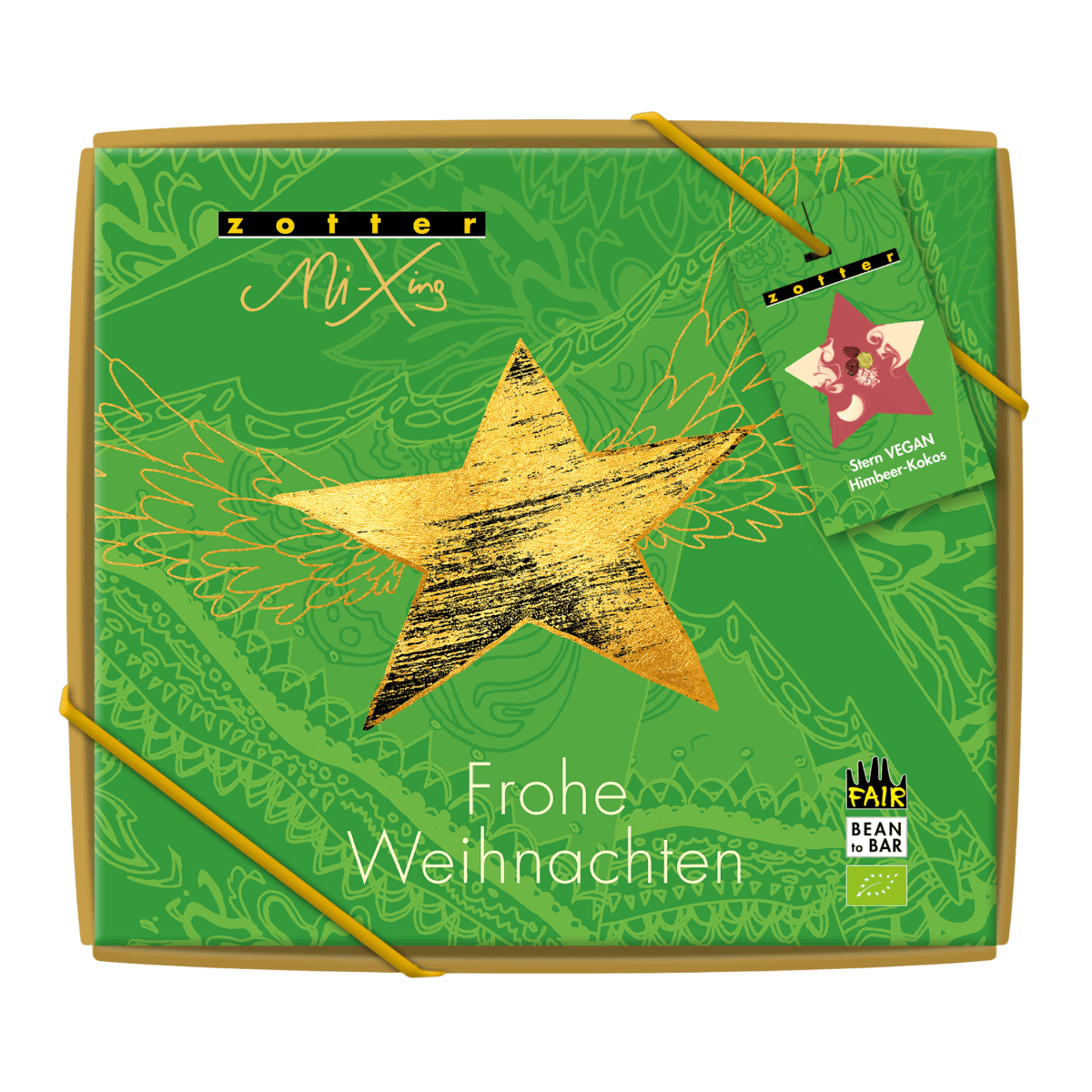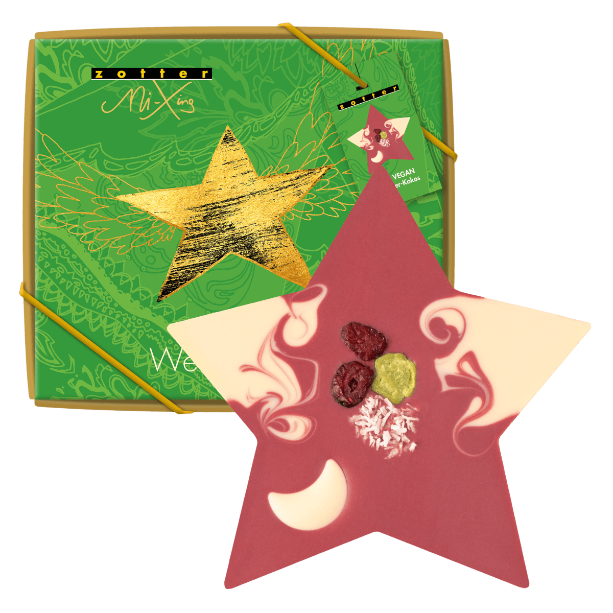 Ein Stern aus veganer Himbeer-Kokos-Kuvertüre verziert mit einem Muster aus weißer Reiskuvertüre. Verziert mit einem Kokos- Schokomond, weißen Kokosflocken, fruchtigen Moosbeeren und einem knusprigen Grüntee-Schokoflake. Verpackt in einer weihnachtlichen Geschenkbox.